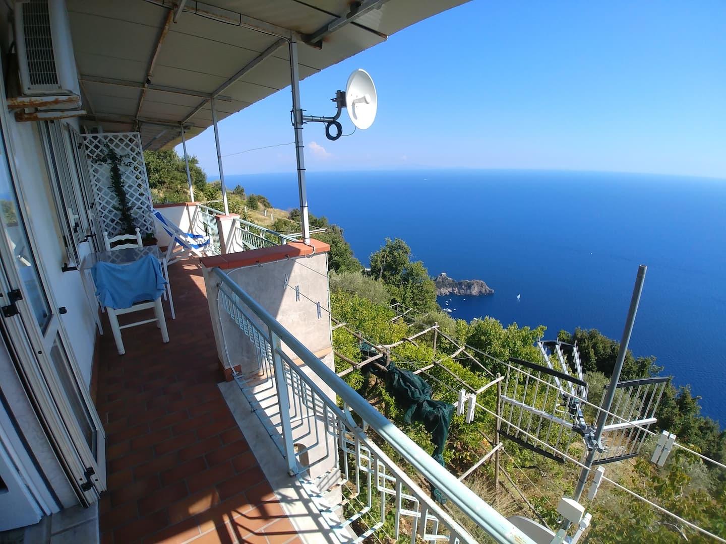 The house is situated in a peaceful hilly area near the Amalfi Coast, surrounded by lush greenery and well-maintained gardens. The terrace offers a panoramic view of the sea, with the Gulf of Salerno on one side and the island of Capri on the other, providing stunning vistas at any time of the day. The atmosphere is private and relaxing, perfect for those looking to escape the daily hustle and enjoy the tranquility of nature.